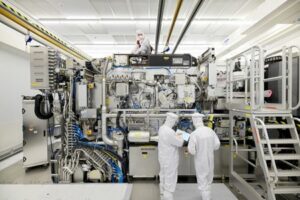 FILE PHOTO: Employees are seen working on the final assembly of ASML’s TWINSCAN NXE:3400B semiconductor lithography tool with its panels removed, in Veldhoven, Netherlands, in this picture taken April 4, 2019. Bart van Overbeeke Fotografie/ASML/Handout via REUTERS/File Photo