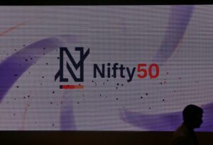 A man walks past a new brand identity for Nifty Indices inside the National Stock Exchange (NSE) building in Mumbai, India, May 28, 2019. REUTERS/Francis Mascarenhas/File Photo