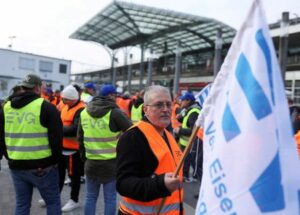 FOTO DE ARCHIVO: Manifestación de trabajadores del sector ferroviario durante una huelga convocada por el sindicato EVG por cuestiones salariales, frente a la estación central de Colonia, Alemania, el 21 de abril de 2023. REUTERS/Thilo Schmuelgen