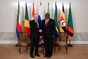 Russian President Vladimir Putin shakes hands with South African President Cyril Ramaphosa during a meeting in Saint Petersburg, Russia June 17, 2023. Ramil Sitdikov/Host photo agency RIA Novosti via REUTERS
