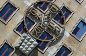 FILE PHOTO: The logo of Bayer AG is pictured at the facade of the historic headquarters of the German pharmaceutical and chemical maker in Leverkusen, Germany, April 27, 2020. REUTERS/Wolfgang Rattay/File Photo