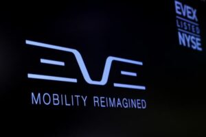 El logo de Eve Air Mobility se muestra en una pantalla durante el debut de la compañía en el piso de la Bolsa de Valores de Nueva York (NYSE) en la ciudad de Nueva York, EEUU, el 10 de mayo de 2022.
