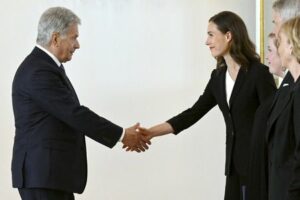 Finnish President Sauli Niinisto shakes hands with outgoing Prime Minister Sanna Marin at the Presidential Palace in Helsinki, Finland, June 20, 2023. Lehtikuva/ Jussi Nukari/ via REUTERS