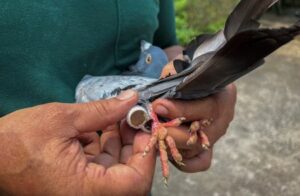 A policeman and trainer Parshuram Nanda shows a capsule tied to a leg of a Belgian homer pigeon, which carries the message, during training, in Cuttack, in the eastern state of Odisha, India, June 9, 2023. REUTERS/Sunil Kataria