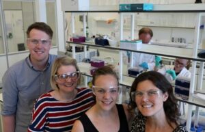 Senior team members of biotechnology research company HydRegen, Matt Hodges, Rhiannon Evans, Holly Reeve and Sarah Cleary pose for a photo in their laboratory facility, based at University of Oxford Begbroke Science Park, in Kidlington near Oxford, Britain, June 16, 2023. REUTERS/Toby Melville