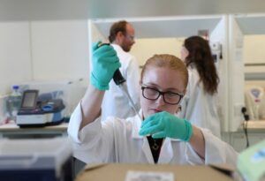 Chemist Zoe Sheaf prepares carbon suspension for bio catalytic hydrogenation at biotechnology research company HydRegen, based at University of Oxford Begbroke Science Park, in Kidlington near Oxford, Britain, June 16, 2023. REUTERS/Toby Melville
