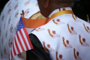 A supporter of Indian Prime Minister Narendra Modi wears clothing with an image of Modi, outside the Lotte hotel in New York City, New York, U.S., June 20, 2023. REUTERS/Mike Segar