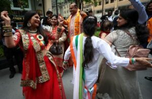 Supporters dance ahead the arrival of Indian Prime Minister Narendra Modi, outside the Lotte hotel in New York City, New York, U.S., June 20, 2023. REUTERS/Mike Segar