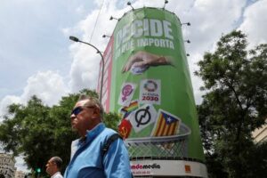 FILE PHOTO: A far-right Vox party sign hangs from the exterior of a building in central Madrid showing a hand dropping cards with symbols representing feminism, communism, the LGBTQ+ community, the squatters movement and the Catalan independence flag into a rubbish bin, in Madrid, Spain, May 20, 2023. REUTERS/Violeta Santos Moura/File Photo