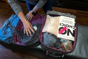 Before flying to spend several days running the Alamo Women’s Clinic in Carbondale, Illinois, clinic manager Andrea Gallegos, 40, packs her suitcase at her home in San Antonio, Texas, U.S., April 19, 2023. In July, her family will leave Texas and move to Illinois. The transition is bittersweet. Seeing her old home packed up and having family and friends over for one last gathering made Gallegos emotional, but she feels the excitement building for the next chapter. “I know now more than ever that this is exactly where I was supposed to be,” Gallegos said. REUTERS/Evelyn Hockstein