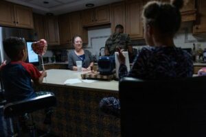 Clinic manager Andrea Gallegos, 40, talks with her children and her husband in their kitchen at home in San Antonio, Texas., U.S., April 18, 2023. In July, her family will leave Texas and move to Illinois. The transition is bittersweet. Seeing her old home packed up and having family and friends over for one last gathering made Gallegos emotional, but she feels the excitement building for the next chapter. “I know now more than ever that this is exactly where I was supposed to be,” Gallegos said. REUTERS/Evelyn Hockstein
