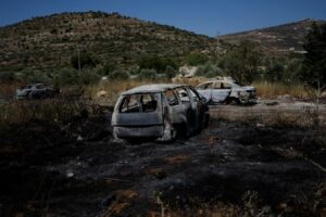 Una vista aérea muestra vehículos quemados tras un ataque de colonos israelíes cerca de Ramala, en Cisjordania ocupada por Israel, el 21 de junio, 2023. REUTERS/Ammar Awad
