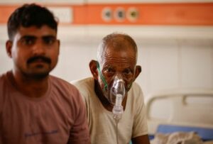 Brijesh Yadav, 28, sits next to his grandfather Suryanath Yadav, 85, who is suffering from breathing difficulties suspected to be heat-related, as he sits on a bed inside a hospital ward in Ballia District in the northern state of Uttar Pradesh, India, June 21, 2023. REUTERS/Adnan Abidi