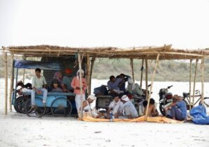 People sit under a shack on a hot summer day on the banks of the river Ganges in Ballia District in the northern state of Uttar Pradesh, India, June 21, 2023. REUTERS/Adnan Abidi