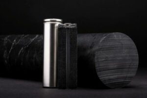An electric vehicle battery cell, a graphite anode (the negative electrode of the battery) and a graphite drill core are seen at the research and development centre of graphite anode company Talga Group in Cambridge, Britain, in this undated handout image taken in October 2020 and obtained by Reuters on June 15, 2022. Steve Wise/27Creative/Handout via REUTERS
