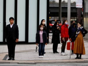FILE PHOTO: People wait for a traffic sign to change on the first day of the Japanese government’s relaxation of official guidance on masks as it emerges from the COVID-19 pandemic, at a shopping district in Tokyo, Japan March 13, 2023. REUTERS/Kim Kyung-Hoon/FILE PHOTO