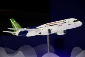 A model Comac C919 single-aisle airliner is displayed at the Commercial Aircraft Corp of China pavilion at the 54th International Paris Airshow at Le Bourget Airport near Paris, France, June 21, 2023. REUTERS/Benoit Tessier