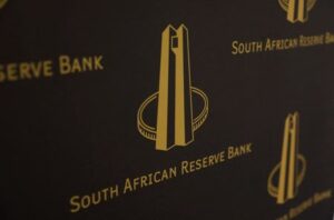 FILE PHOTO: The logo of South Africa’s central reserve bank is seen during the delivery of a keynote address by South Africa’s central bank governor, Lesetja Kganyago, at the University of the Witwatersrand in Johannesburg, South Africa, November 1, 2022. REUTERS/Siphiwe Sibeko/File Photo