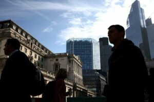 FILE PHOTO: People walk outside the Bank of England in the City of London financial district in London, Britain May 11, 2023. REUTERS/Henry Nicholls/File Photo
