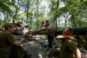 Ukrainian servicemen of the 30th Kostiantyn Ostrozkyi Separate Mechanized Brigade talk next to a T-80 main battle tank captured earlier from Russian troops, at a position near the front line town of Bakhmut, amid Russia’s attack on Ukraine, in Donetsk region, Ukraine June 19, 2023. Radio Free Europe/Radio Liberty/Serhii Nuzhnenko via REUTERS