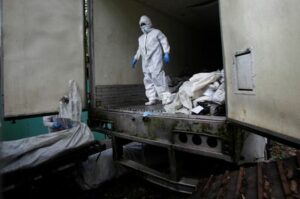 Técnicos forenses descargan un cuerpo de un remolque de tractor refrigerado, utilizado para almacenar los cuerpos de las víctimas de un motín mortal en la prisión de mujeres Centro Femenino de Adaptación Social (CEFAS), en una morgue en Tegucigalpa, Honduras. 21 de junio 2023. REUTERS/Fredy Rodriguez