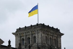 A Ukrainian national flag flies atop the Reichstag building, the seat of Germany’s lower house of parliament Bundestag on the first anniversary of the Russian invasion of Ukraine, in Berlin, Germany February 24, 2023. REUTERS/Fabrizio Bensch/File photo
