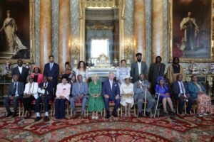 Britain’s King Charles and Queen Camilla pose with Linda Haye, Laceta Reid, Gilda Oliver, Carmen Esme Munroe, Edna Henry, Jessie Stephens, Delisser Bernard, John Richards and Alford Gardener during a reception to mark the 75th anniversary of the arrival of HMT Empire Windrush to British shores, at Buckingham Palace on June 14, 2023 in London, Britain. During the reception to celebrate the Windrush Generation, ten portraits of Windrush elders were unveiled. Chris Jackson/Pool via REUTERS