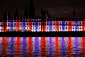 Houses of Parliament are illuminated in colours of British flag following Britain’s King Charles and Queen Camilla’s coronation ceremony, in London, Britain May 6, 2023. REUTERS/Piroschka van de Wouw/FILE PHOTO