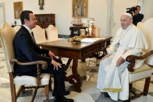El papa Francisco se reúne con el primer ministro de Kosovo, Albin Kurti, en el Vaticano. 22 de junio, 2023. Vatican Media/Handout via REUTERS