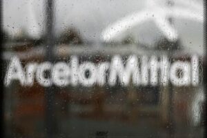 FILE PHOTO: A logo is seen at the ArcelorMittal metals plant in Dunkirk as part of a media tour dedicated to the reduction of carbon intensity of the industry in France, January 16, 2023. REUTERS/Benoit Tessier