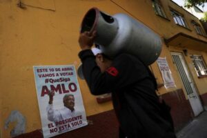 Imagen de archivo. Un vendedor de gas doméstico camina junto a unos carteles que promueven el referéndum revocatorio del 10 de abril sobre la presidencia de Andrés Manuel López Obrador, en Ciudad de México, México. 6 de abril de 2022. REUTERS/Edgard Garrido