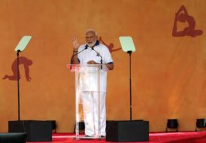 Indian Prime Minister Narendra Modi speaks at the 9th International Day of Yoga event on the north lawn at United Nations headquarters in New York City, New York, U.S., June 21, 2023. REUTERS/Mike Segar