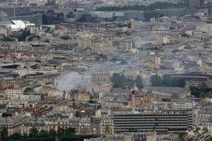 Smoke rises above rooftops following a gas explosion in the fifth arrondissement of Paris, France, June 21, 2023. REUTERS/Stephanie Lecocq