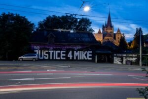 FILE PHOTO: A graffiti calling for justice for Mike Ben Peter is seen in front of the Cathedral, the day before the start of the trial of the six police officers facing homicide charges after he died of a heart attack during his arrest in February 2018, in Lausanne, Switzerland, June 11, 2023. Picture taken with a long exposure. REUTERS/Denis Balibouse/File Photo