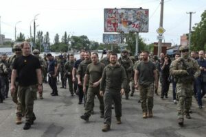 FILE PHOTO: Ukraine’s President Volodymyr Zelenskiy visits a flooded area after the Nova Kakhovka dam breached, amid Russia’s attack on Ukraine, in Kherson, Ukraine June 8, 2023. REUTERS/Stringer