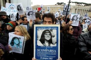 FILE PHOTO: Pietro, brother of Emanuela Orlandi holds a banner with her picture in front of St. Peter square as Pope Benedict XVI leads the angelus prayer December 18, 2011. REUTERS/Stringer/File Photo