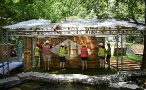 The Greenhouse Theatre ensemble construct their sustainable pop up theatre, in Canary Wharf, London, Britain, June 15, 2023. REUTERS/Alishia Abodunde