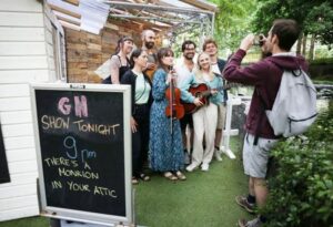 Members of The Greenhouse theatre company, a zero waste pop up theatre, pose for a photograph after a performance of To The Ocean in Canary Wharf, London, Britain June 19, 2023. REUTERS/Anna Gordon
