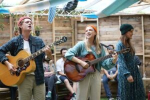 Actors sing during a performance of To The Ocean being performed at The Greenhouse, a zero waste pop up theatre in Canary Wharf, London, Britain June 19, 2023. REUTERS/Anna Gordon