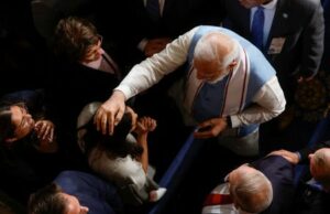 Prime Minister Narendra Modi puts his hand on an attendee’s head as he departs the House Chamber after concluding his address to a joint meeting of Congress, June 22, 2023. REUTERS/Jonathan Ernst