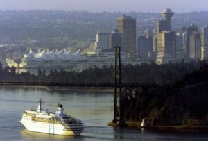 A cruise ship arriving from Alaska makes its way past Stanley Park and under the Lions Gate Bridge as it sails into Vancouver in the early morning of July 27, 1998. REUTERS/Mike Blake – FILE PHOTO