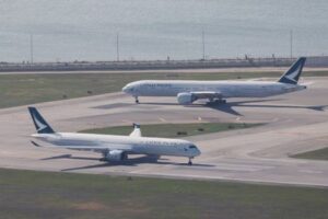 FILE PHOTO: Cathay Pacific aircrafts prepare to take off at the airport, during the coronavirus disease (COVID-19) pandemic in Hong Kong, China, March 31, 2022. REUTERS/Tyrone Siu