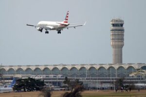 An American Airlines Embraer ERJ-190AR airplane flies past the tower where air traffic controllers work despite not receiving their paychecks, on the 22nd day of a partial government shutdown at Reagan National Airport in Washington, U.S., January 12, 2019. REUTERS/Joshua Roberts