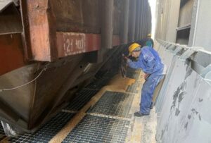 FILE PHOTO: A port worker checks a Ukrainian cereal train carriage in the Black Sea port of Constanta, Romania, May 11, 2022. REUTERS/Olimpiu Gheorghiu/File Photo