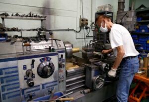 FOTO DE ARCHIVO: Un hombre maneja una máquina en el fabricante de pantallas de lámparas Seiko SCM en Higashiosaka, Japón. 24 de junio, 2022. REUTERS/Sakura Murakami