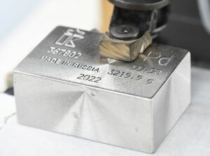 A machine engraves information on an ingot of 99.98 percent pure palladium at the Krastsvetmet non-ferrous metals plant in the Siberian city of Krasnoyarsk, Russia March 10, 2022. REUTERS/Alexander Manzyuk