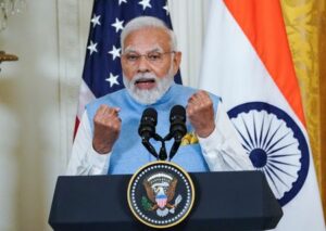 India’s Prime Minister Narendra Modi speaks with clenched fists during a joint press conference with U.S. President Joe Biden at the White House in Washington, U.S., June 22, 2023. REUTERS/Kevin Lamarque