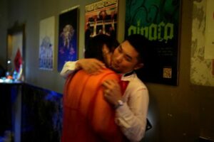 People hug at a voguing “ball” in Shanghai, China, May 13, 2023. Voguing is a dance style characterised by staccato hand motions and angular arm and body postures punctuated by brief pauses. Popularised in 1990 by a hit Madonna song and the documentary, ‘Paris is Burning’, the trend has drawn adherents in China too, with Shanghai’s first such event organised five years ago. REUTERS/Aly Song