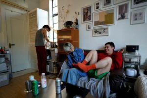 House of Kawakubo members Sui Kawakubo, 25, Tinora Kawakubo, 27, and VJ Kawakubo, 30, (L-R) tell jokes at Sui’s house in Shanghai, China, May 8, 2023. VJ was one of the city’s earliest adopters of voguing, drawn to a dance class seven years ago. Although the performance aspect of voguing is important, he said, its ability to bring people together gave the scene deeper meaning. “If you are just dancing by yourself, there is no meaning in that,” said VJ “The most important thing for me is that it’s a comfortable environment.” REUTERS/Aly Song