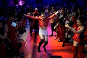 VJ Kawakubo, 30, and other members of the House of Kawakubo dance at a voguing “ball” in Shanghai, China, May 13, 2023. VJ was one of the city’s earliest adopters of voguing, drawn to a dance class seven years ago. Although the performance aspect of voguing is important, he said, its ability to bring people together gave the scene deeper meaning. “If you are just dancing by yourself, there is no meaning in that,” said VJ “The most important thing for me is that it’s a comfortable environment.” REUTERS/Aly Song